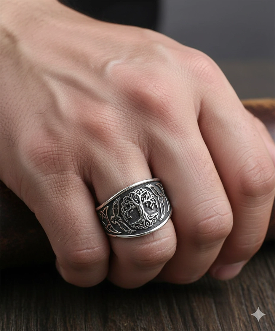 Ó buscadores da sabedoria e das raízes cósmicas, apresento a vocês um sagrado anel de Yggdrasil, a Árvore do Mundo. Esta joia venerável transcende a estética, sendo um símbolo profundo que conecta os reinos espirituais e representa a estrutura do cosmos na mitologia nórdica.